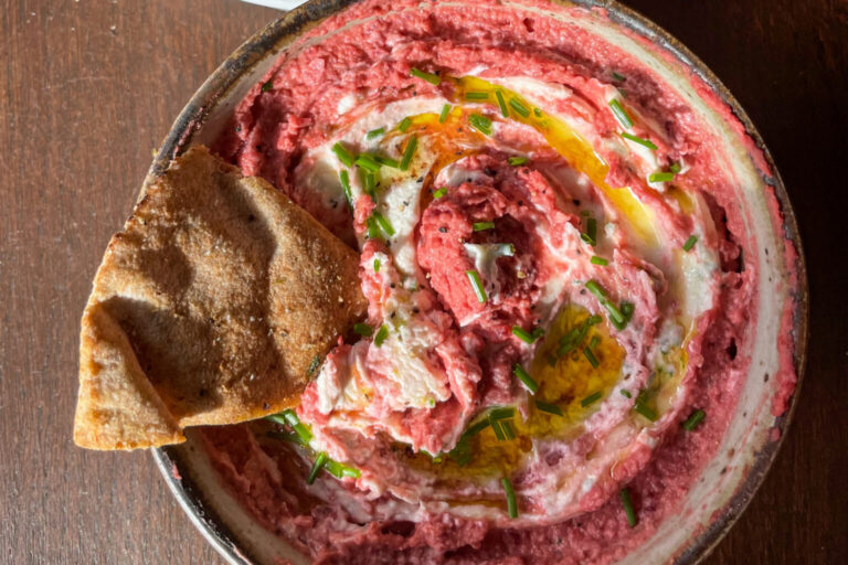 Houmous de betterave au fromage de chèvre fouetté et chips de pita maison